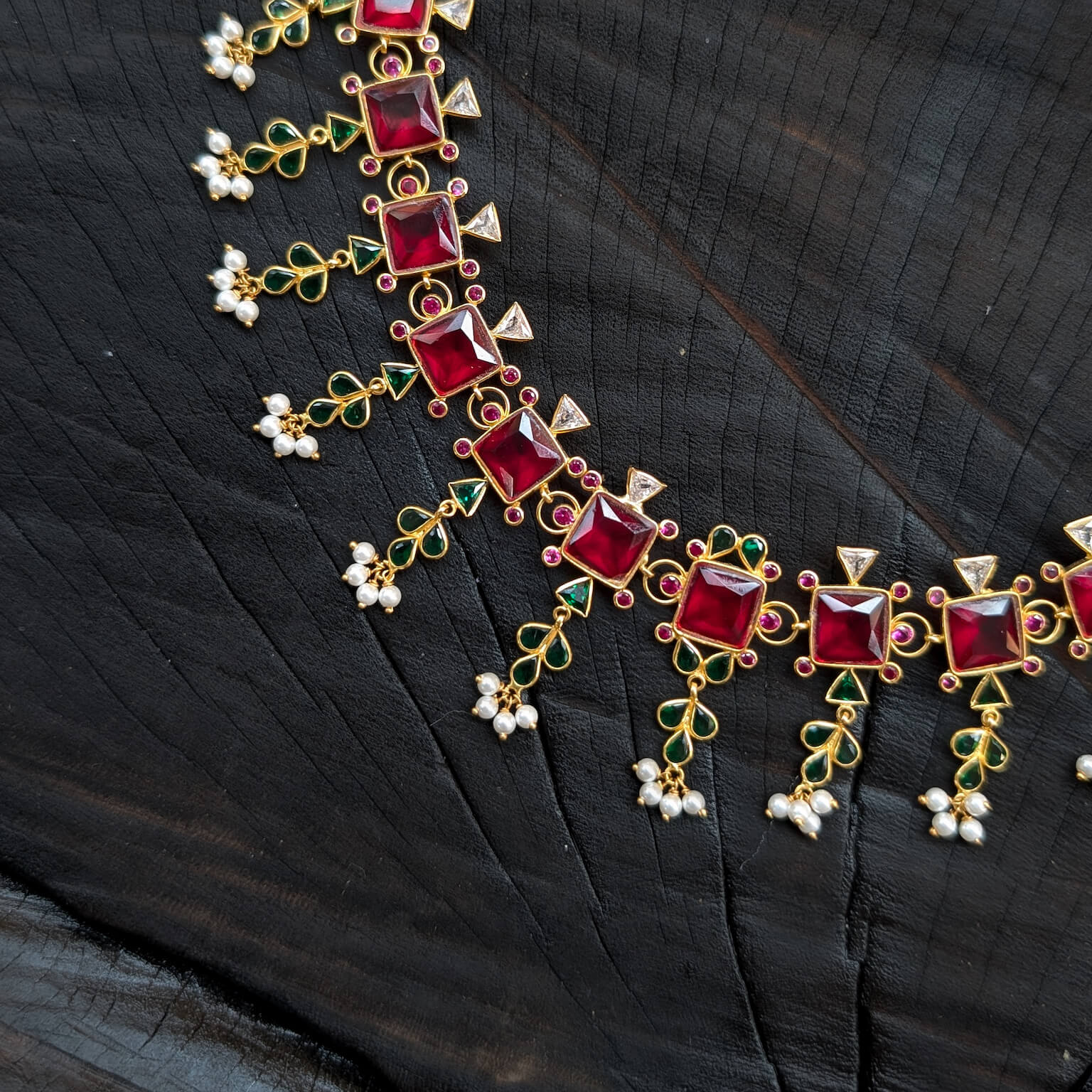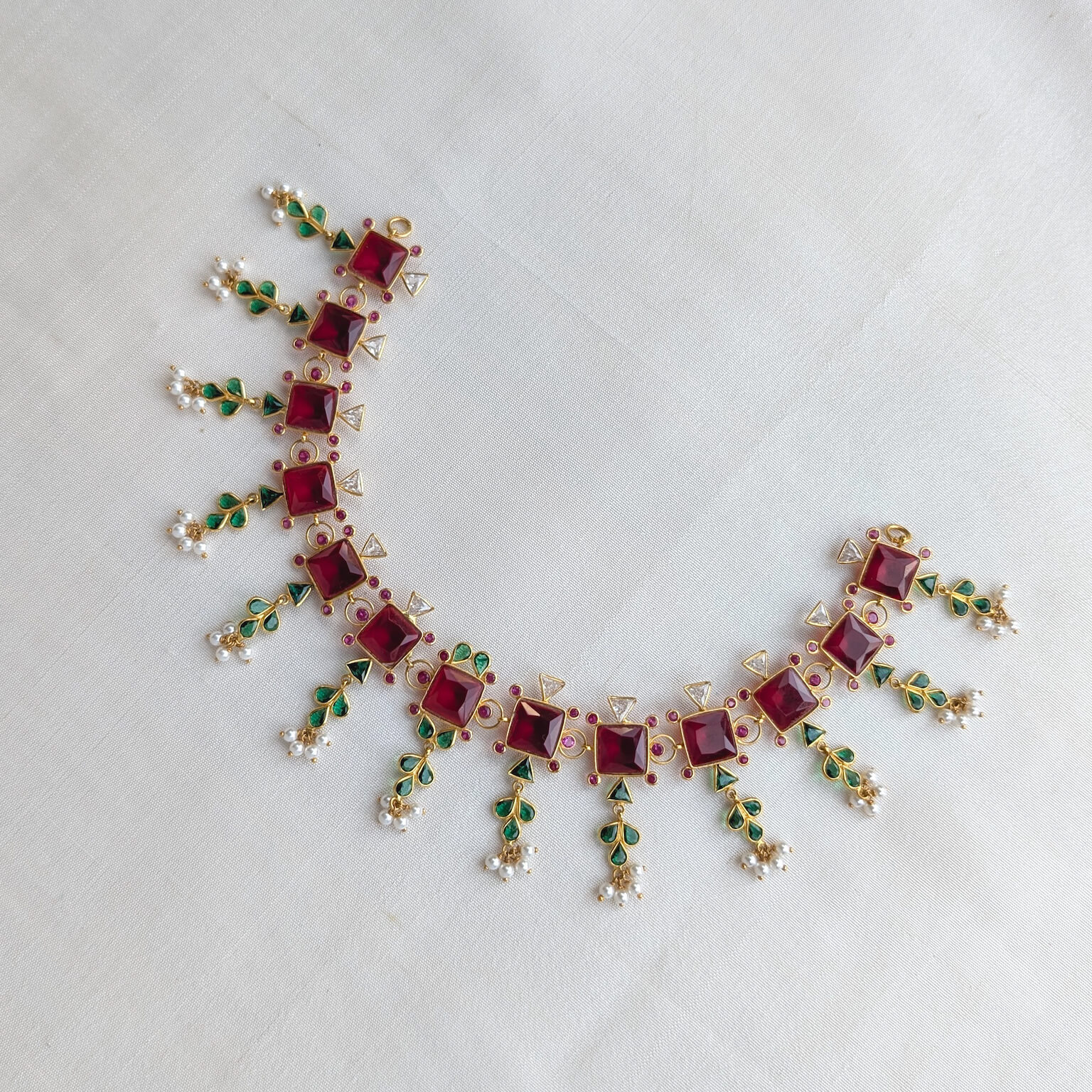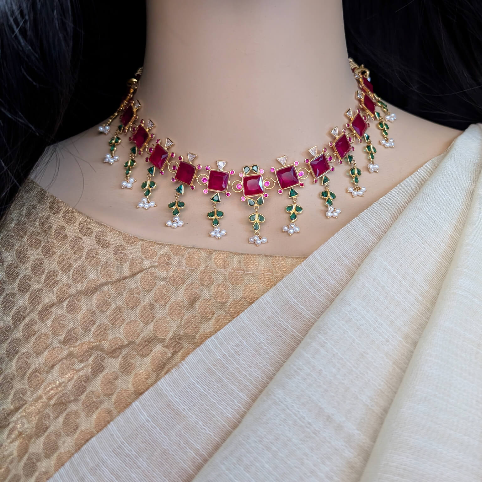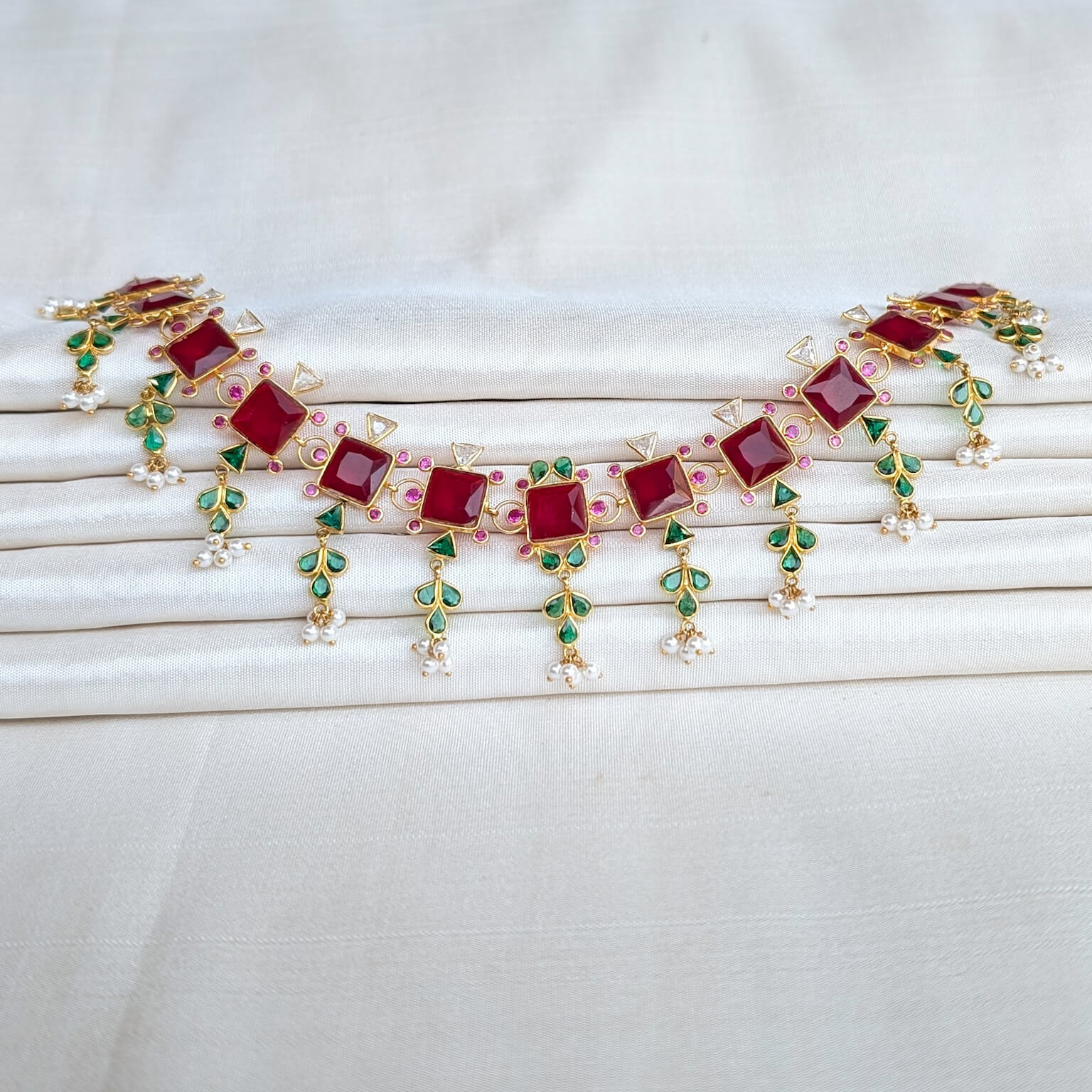 Tags: Color CZ, CZ, Gemstone Jewellery, Gifts For Her, Green Stone, Jadau, Necklace, Pearl, Pink Stone, Red Stone, Short, Synthetic Polki, Women