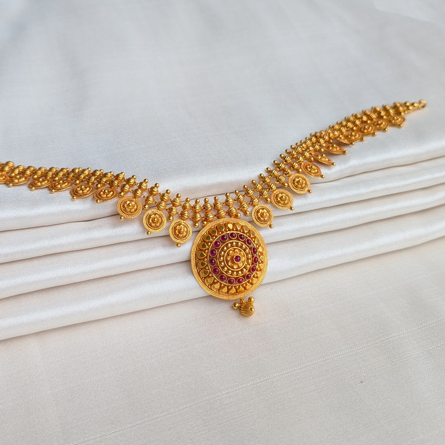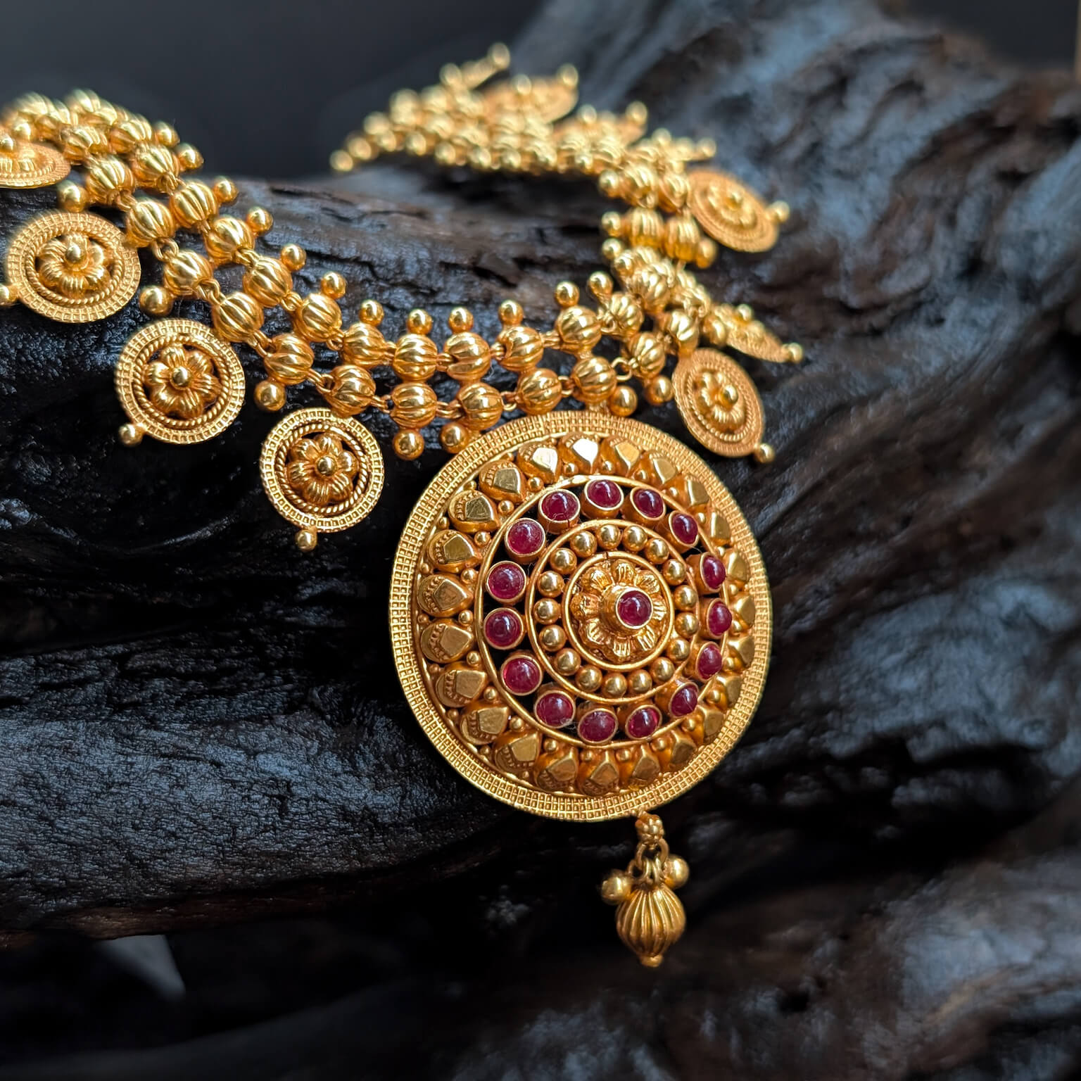 Necklace – Short – Antique Floral Cob Ruby Gold Ball Hanging