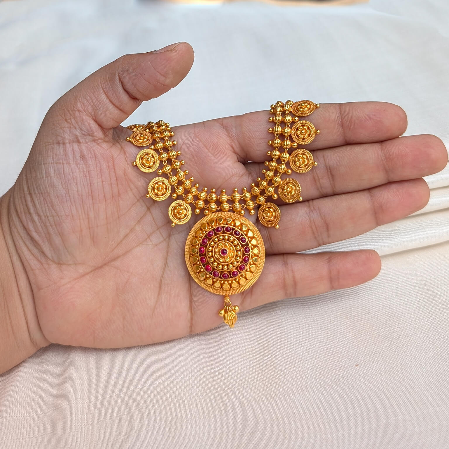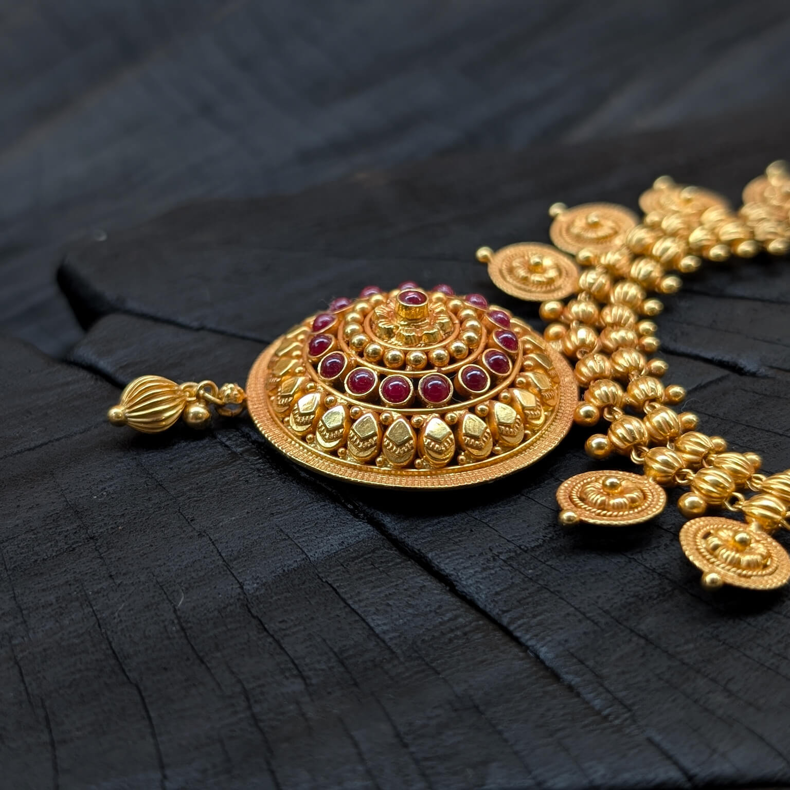 Necklace - Short - Antique Floral Cob Ruby Gold Ball Hanging