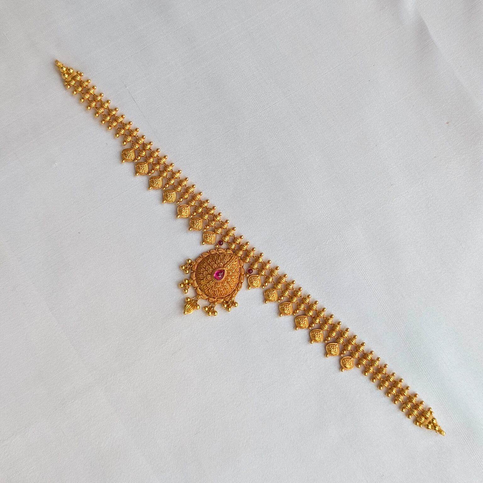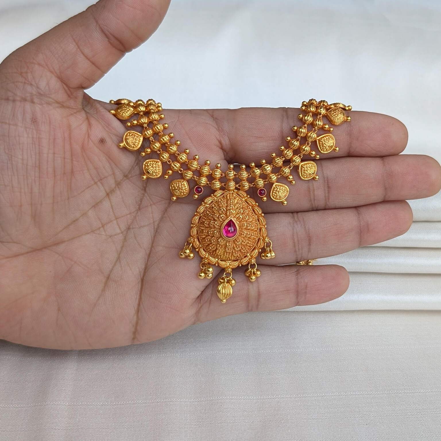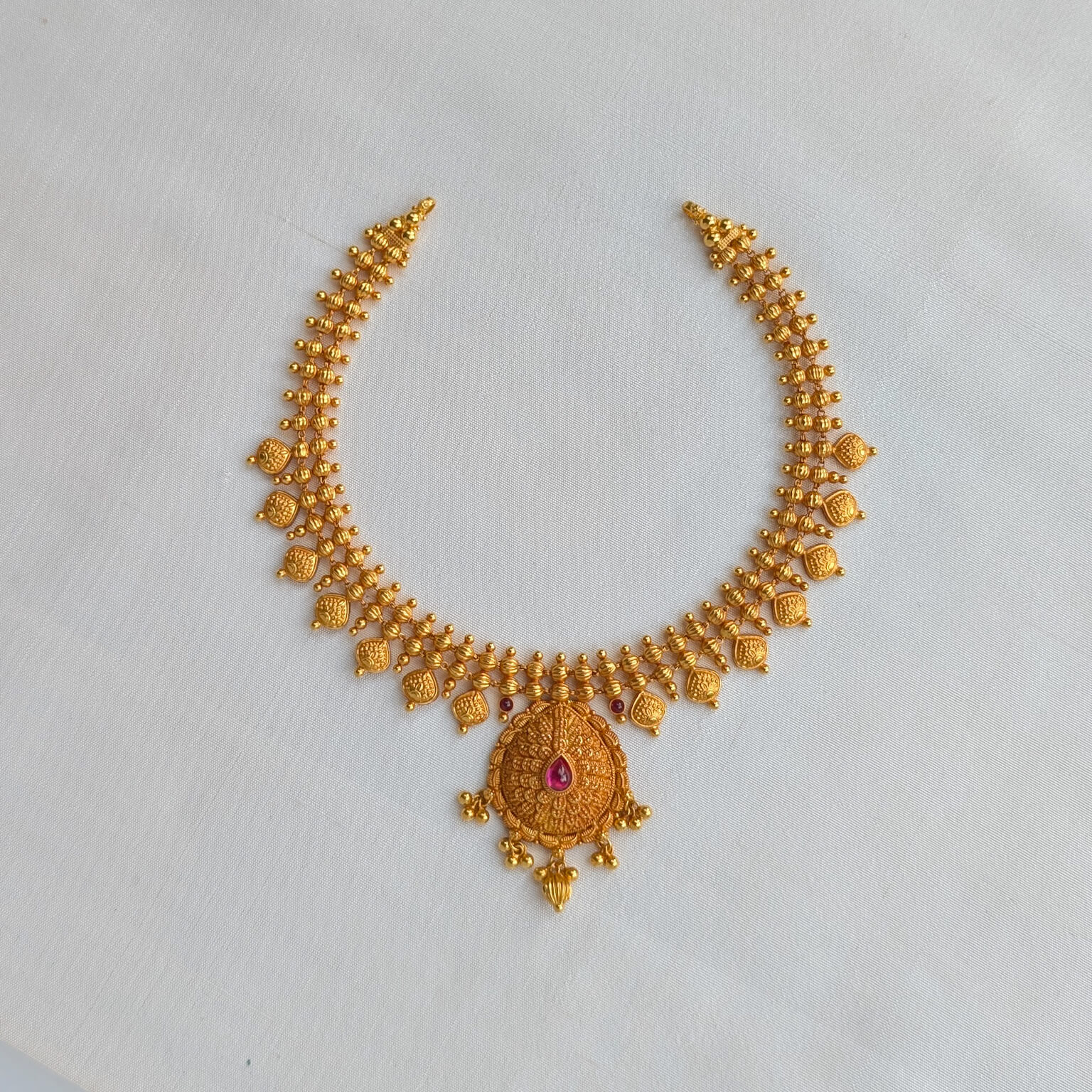 Necklace - Short - Antique Floral Cob Ruby Gold Ball Hanging