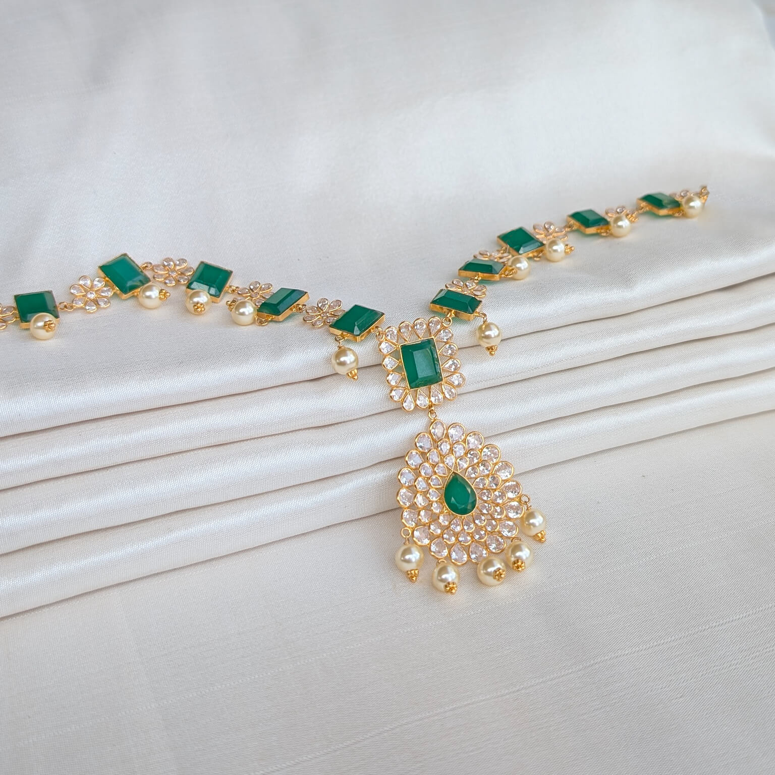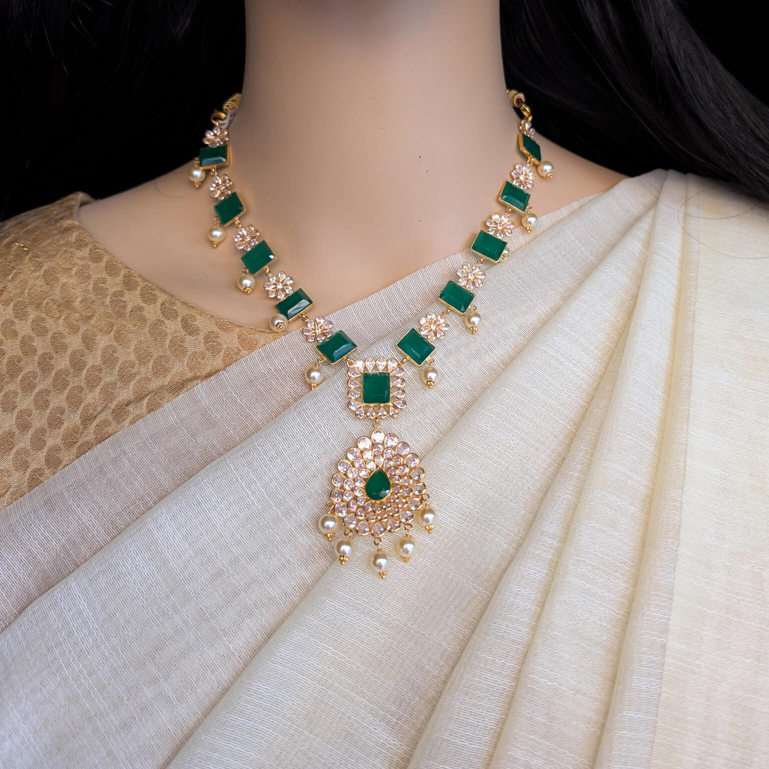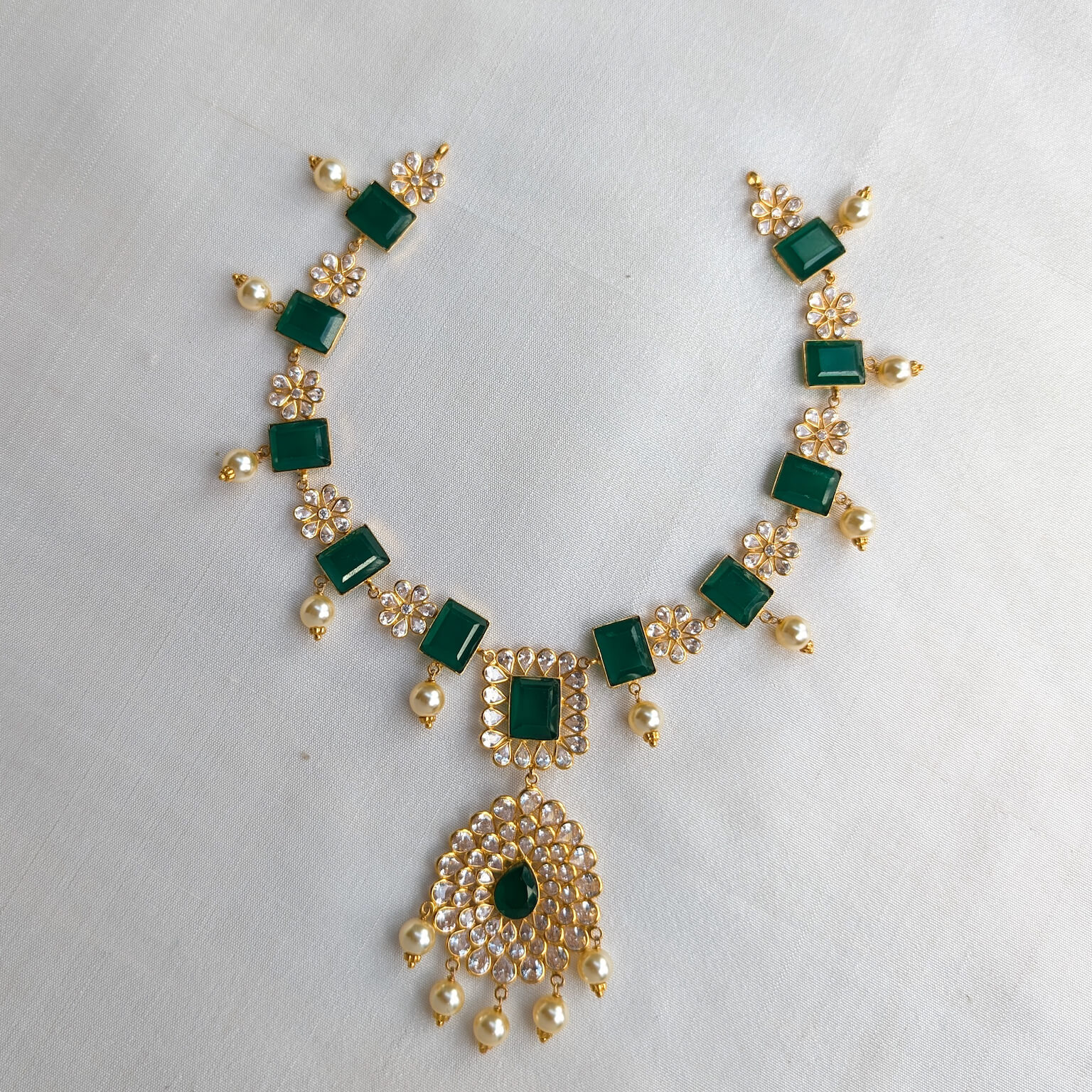Tags: Color CZ, CZ, Gemstone Jewellery, Gifts For Her, Green Stone, Jadau, Necklace, Pearl, Short, Synthetic Polki, Women