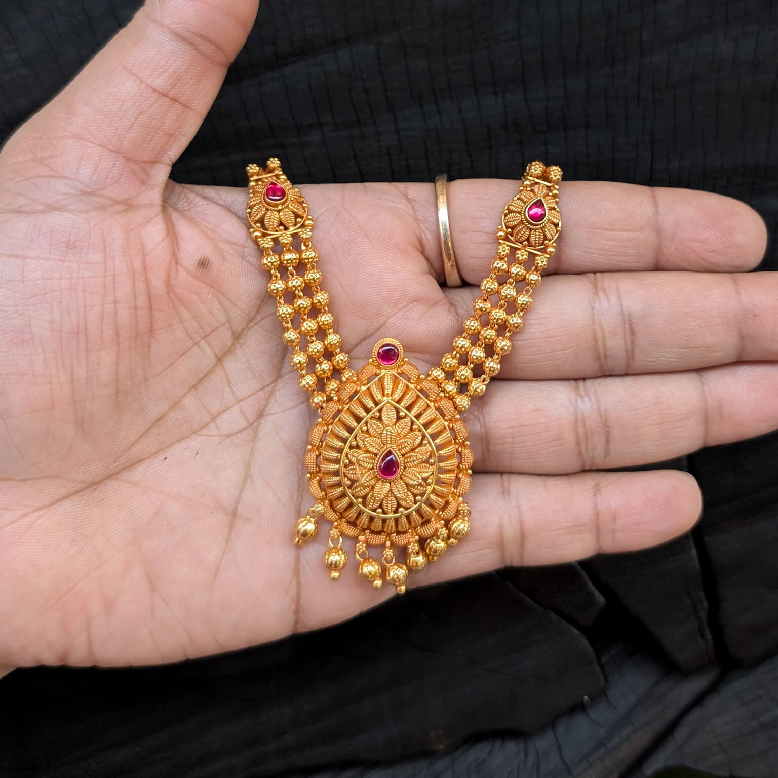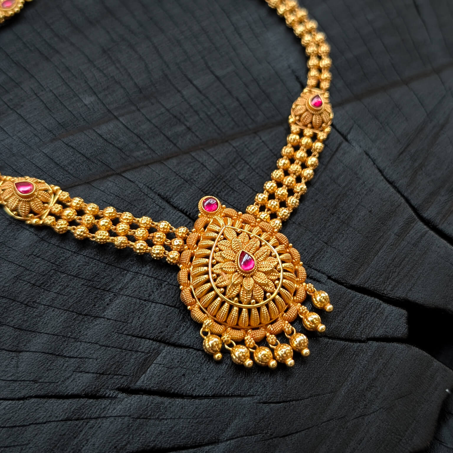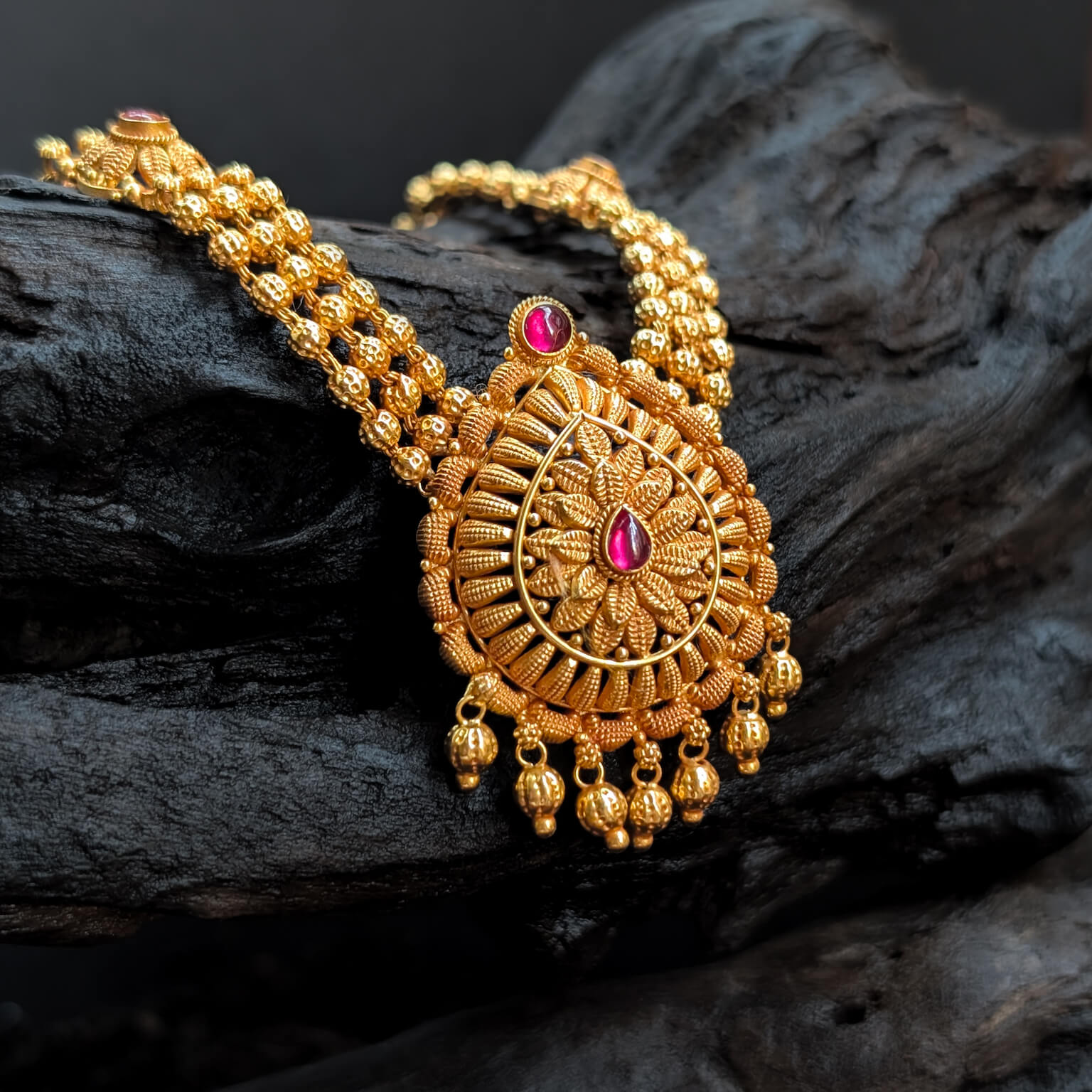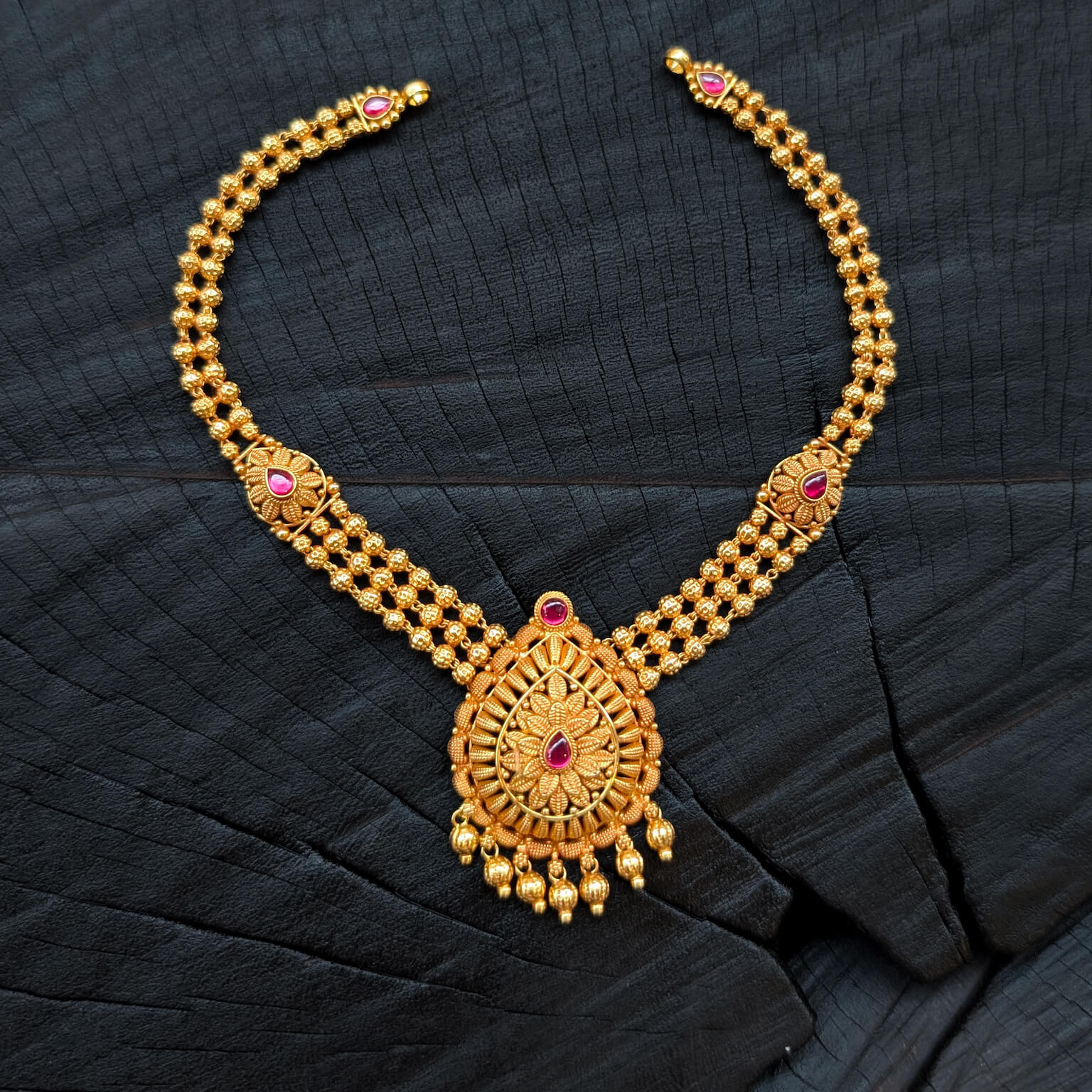 Necklace - Short - Antique Floral Cob Ruby Gold Ball Hanging