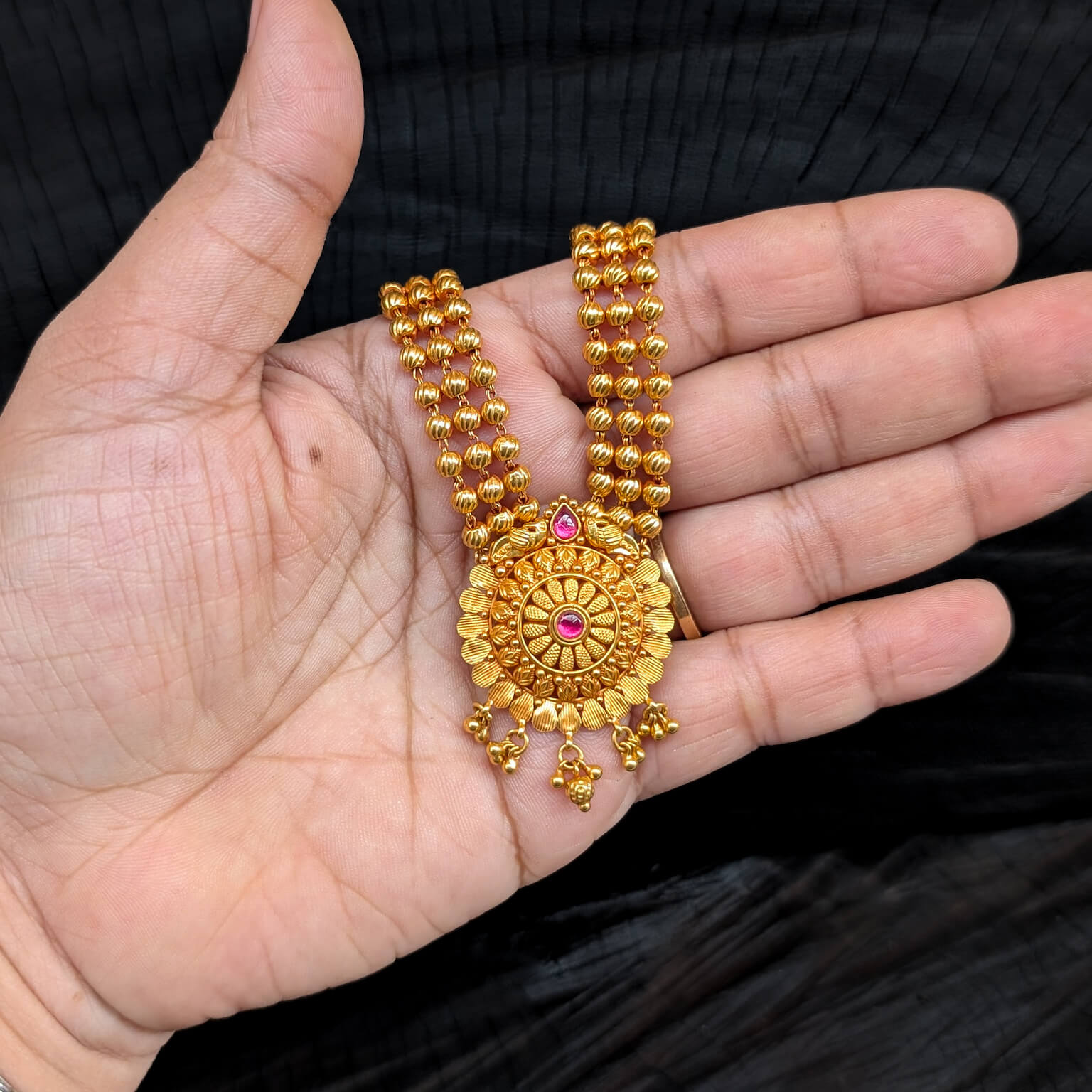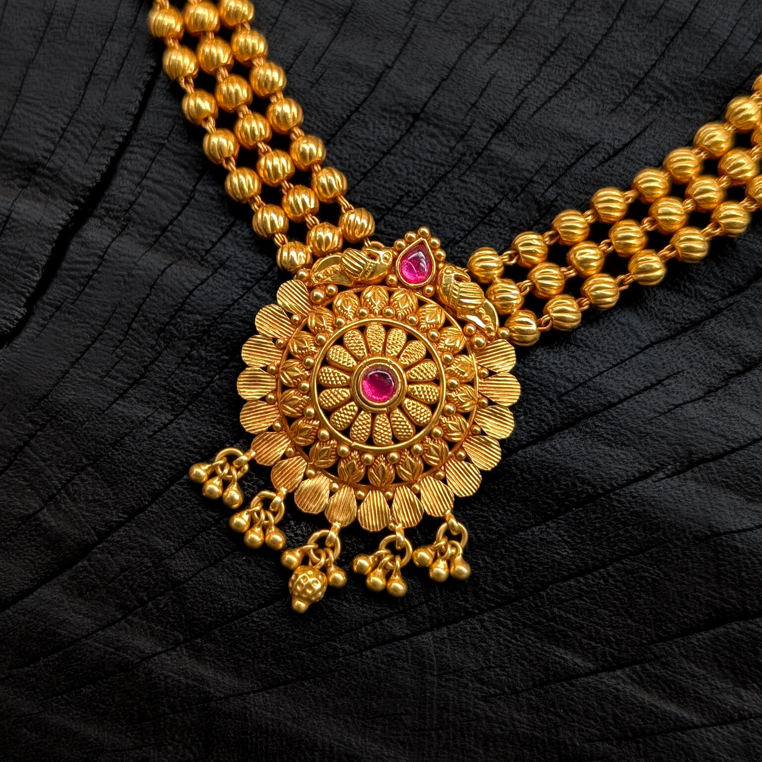 Necklace – Short – Antique Floral Center Cob Ruby Gold Hanging
