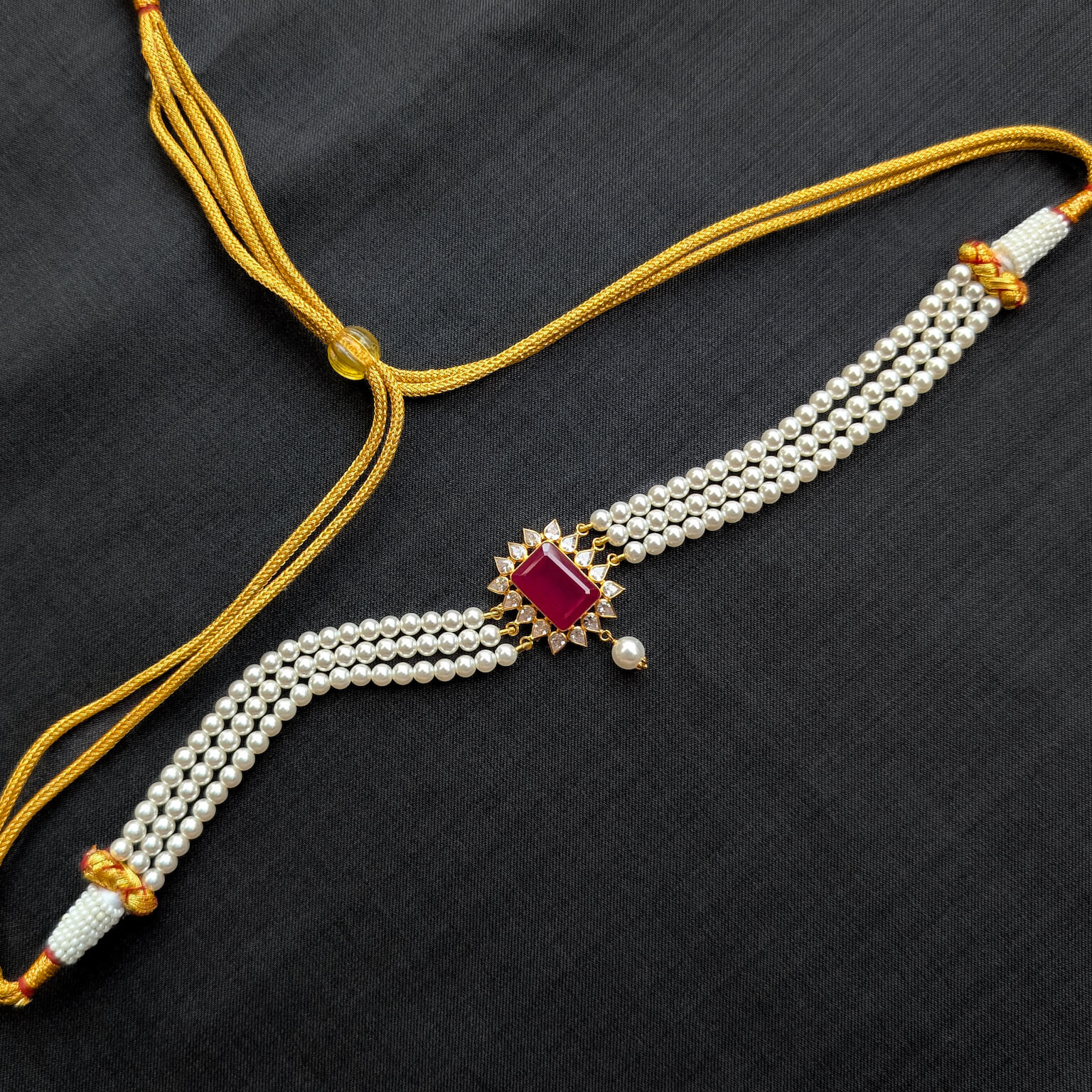 Tags: Choker, Color CZ, CZ, Dori, Gemstone Jewellery, Gifts For Her, Jadau, Necklace, Pearl, Red Stone, Short, String Work, Synthetic Polki, Women