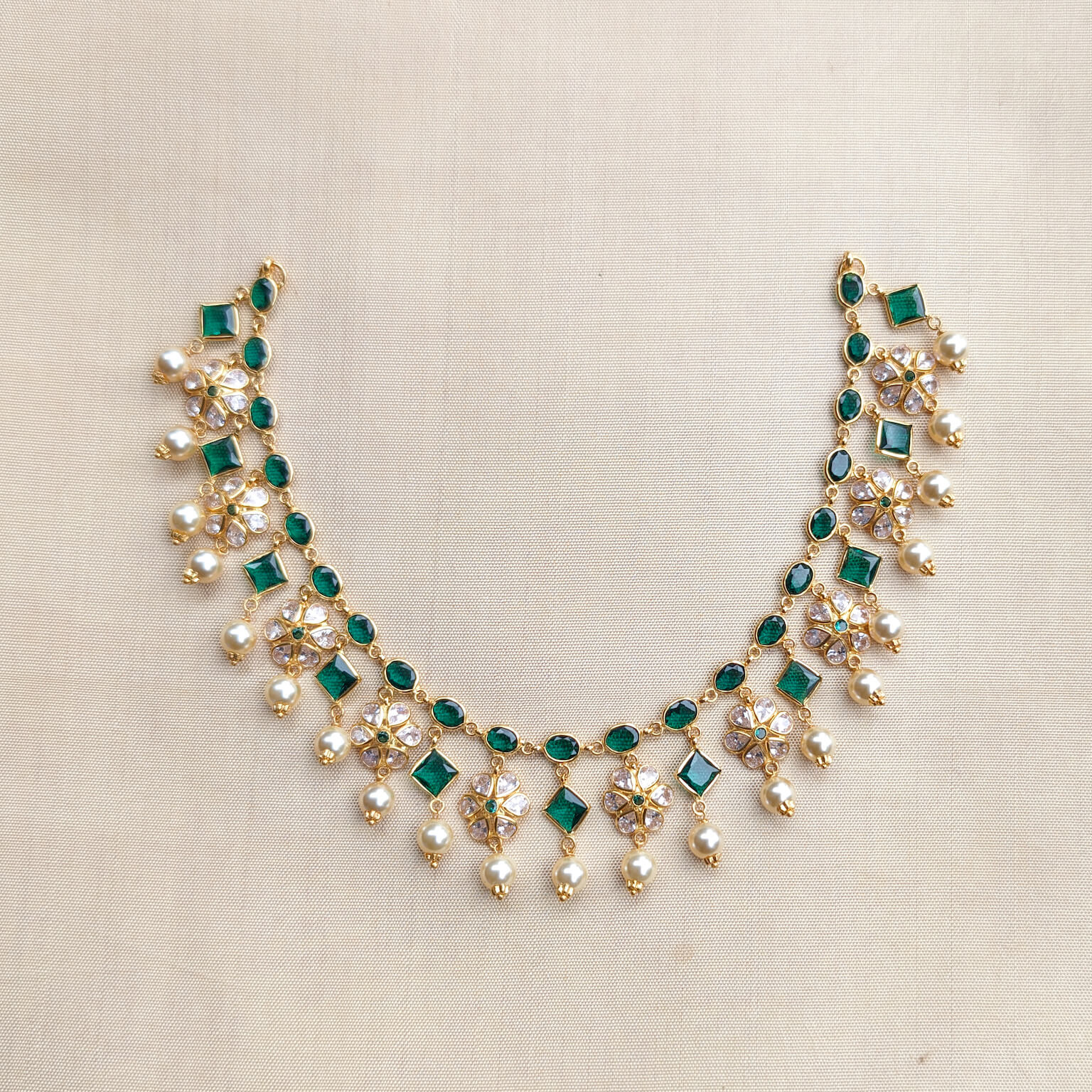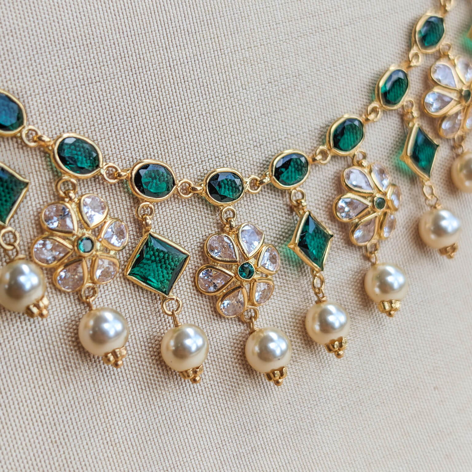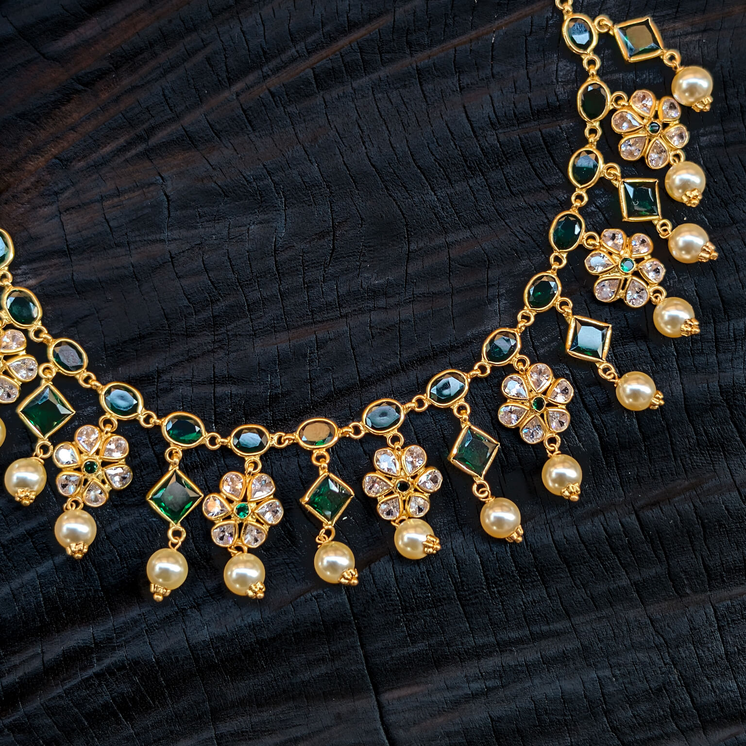 Tags: Color CZ, CZ, Gemstone Jewellery, Gifts For Her, Green Stone, Jadau, Necklace, Pearl, Short, Synthetic Polki, Women
