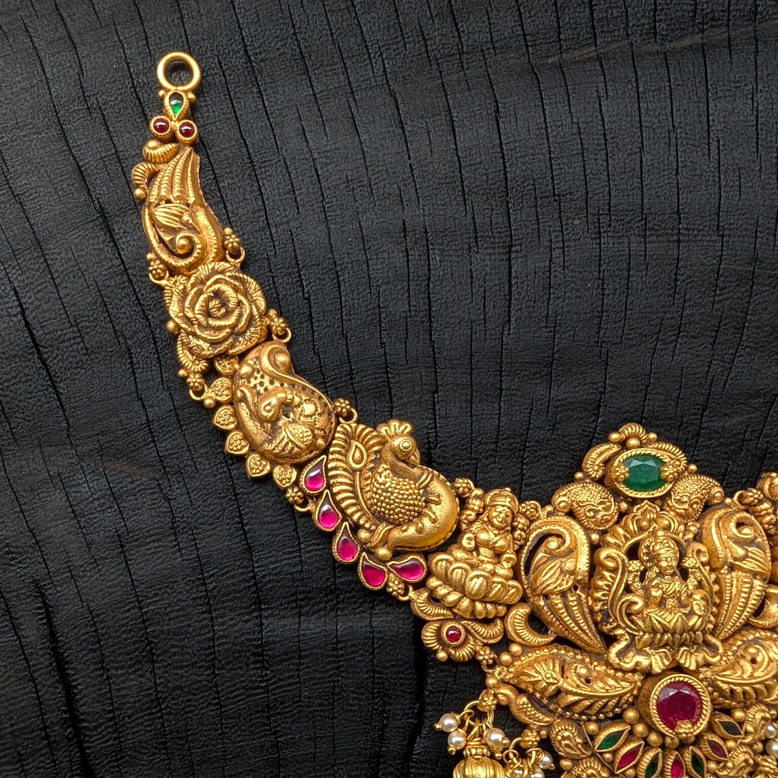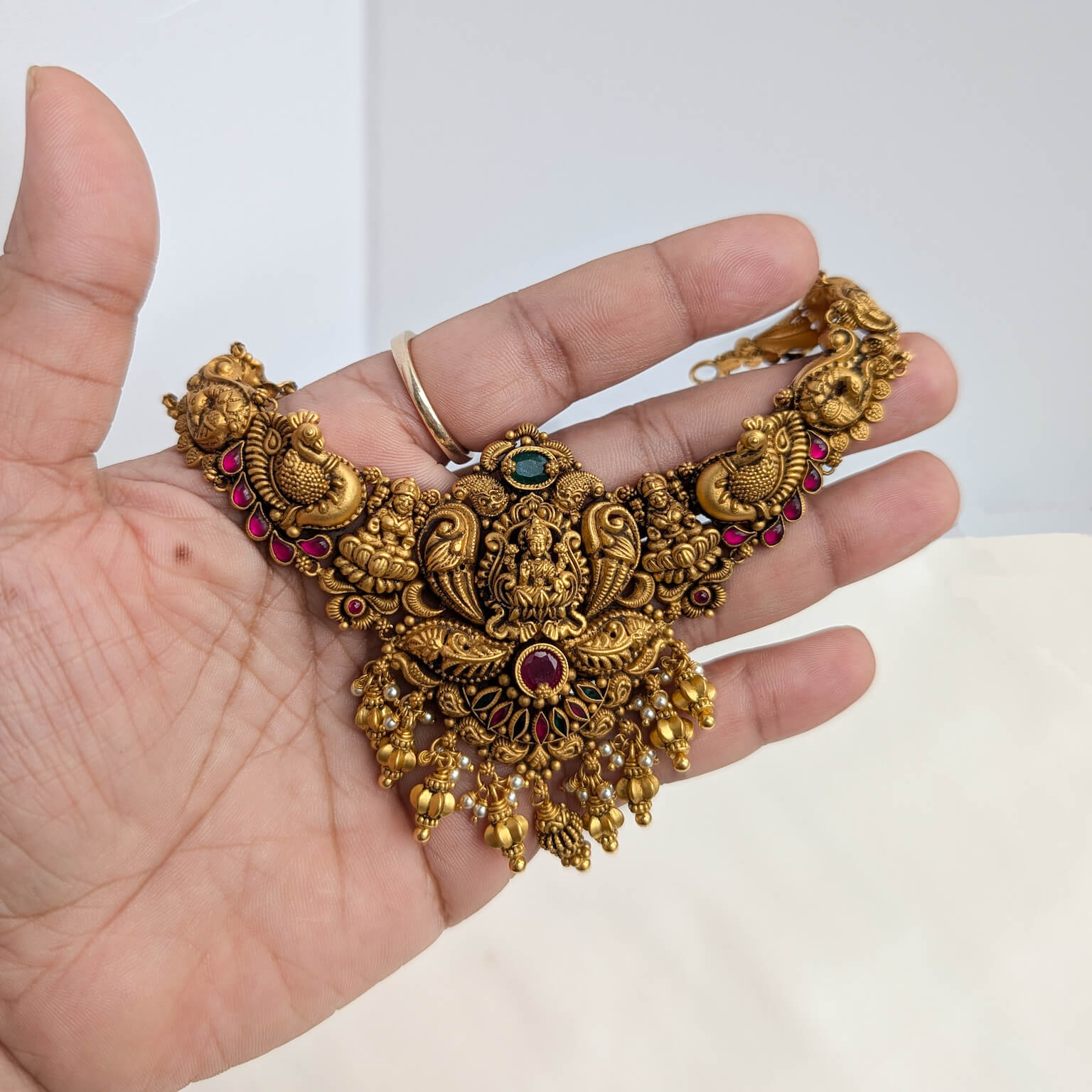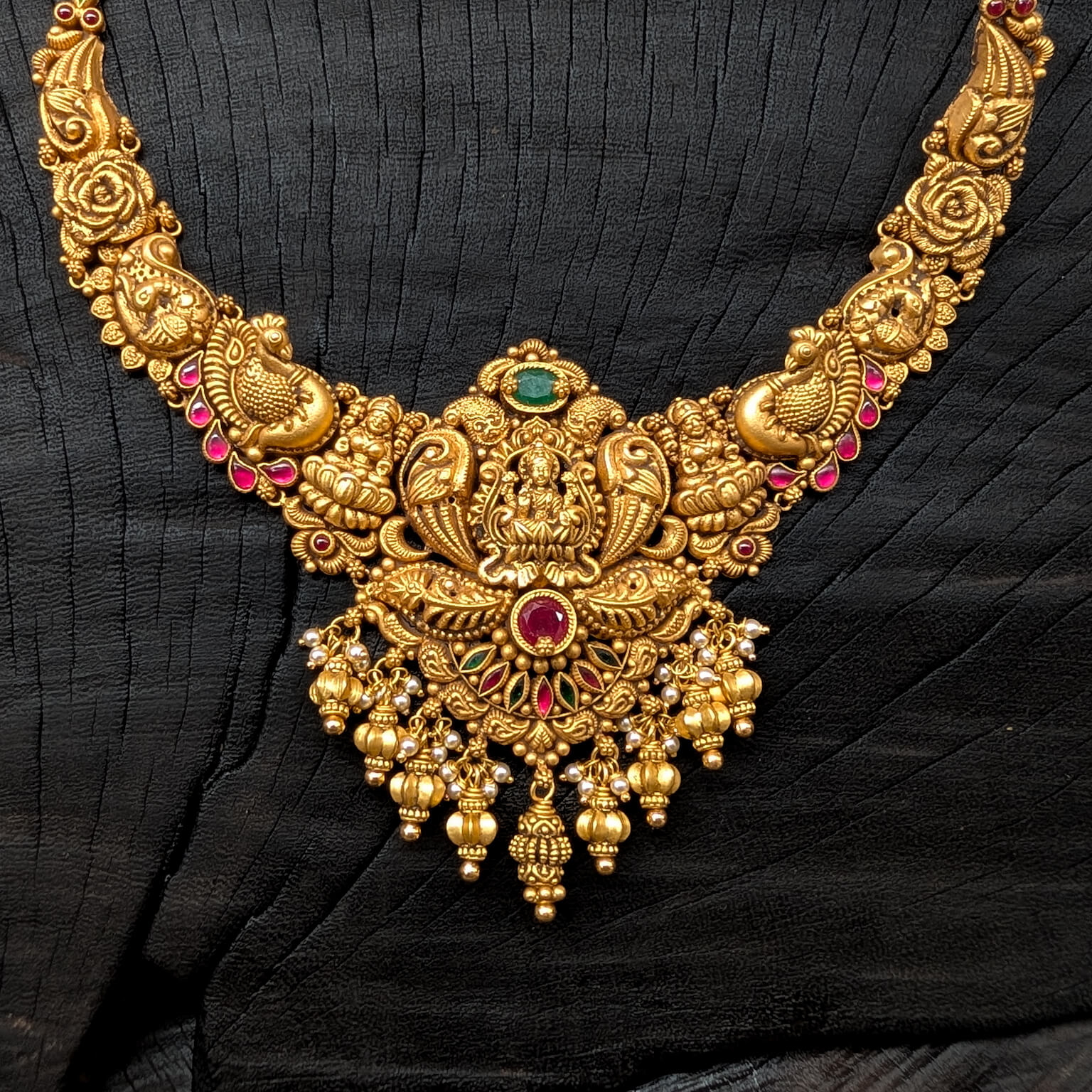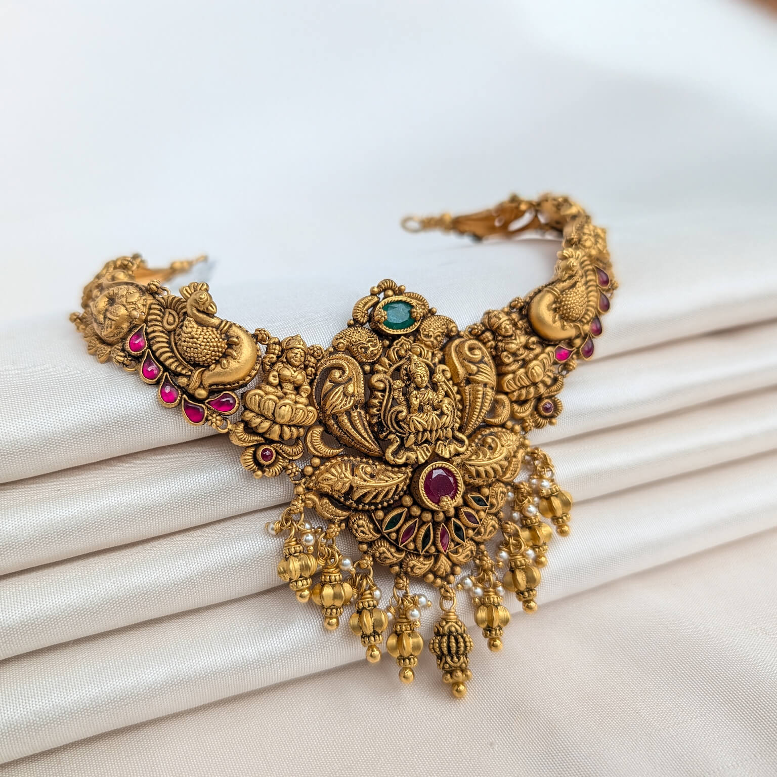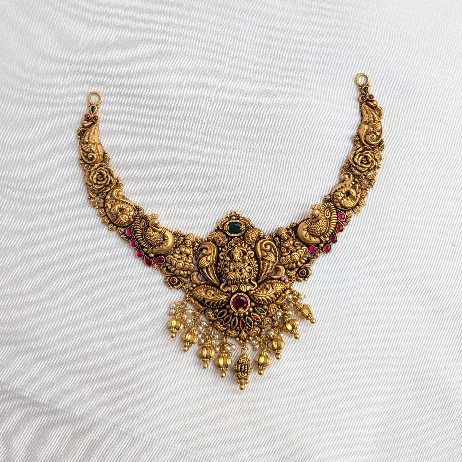 Tags: Antique, Antique Jewellery, Cob Emerald, Cob Ruby, EF, Electro Forming, god, Green Stone, Lakshmi, Necklace, Pearl, Red Stone, Short, Women