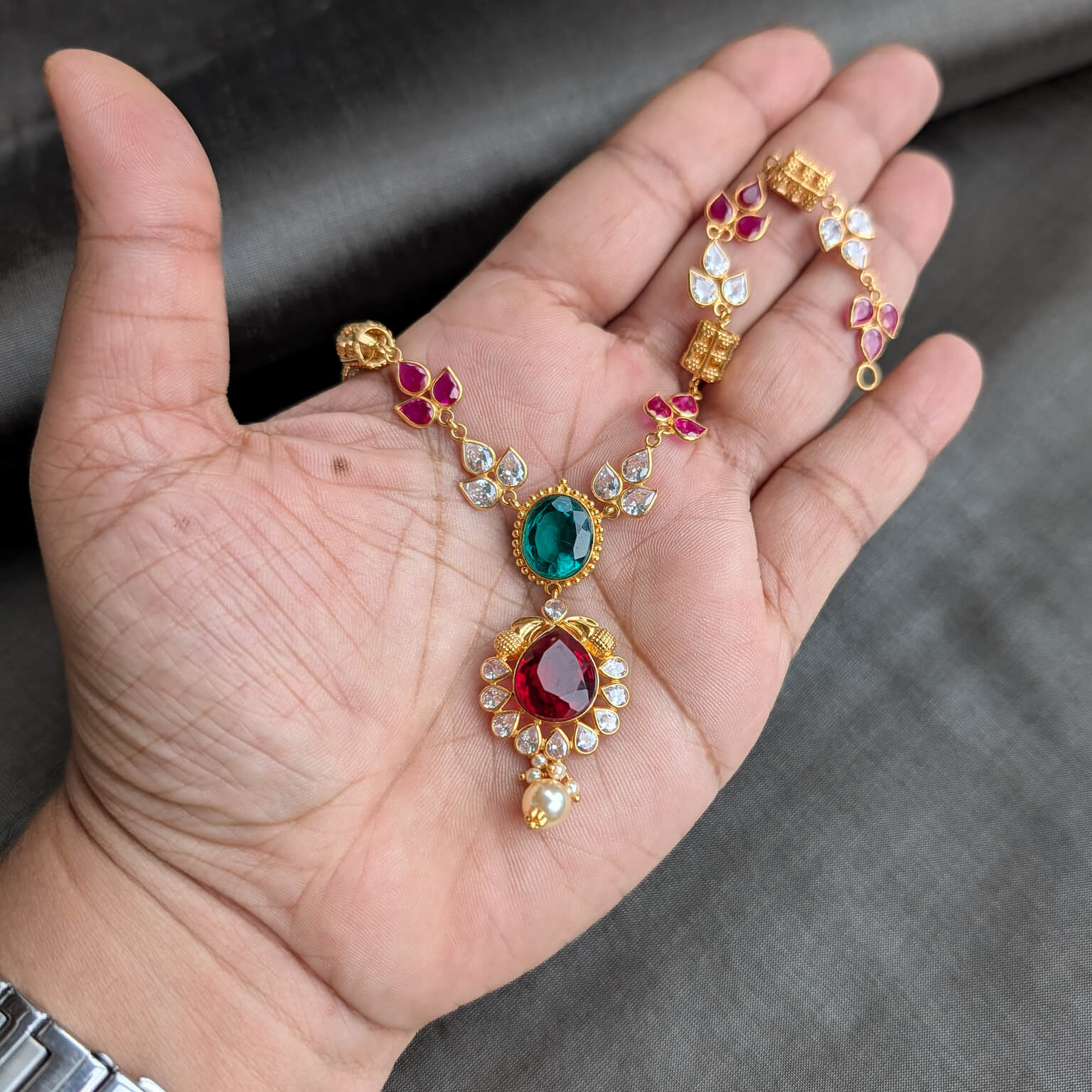 Tags: Color CZ, CZ, Gemstone Jewellery, Gifts For Her, Green Stone, Jadau, Necklace, Pearl, Red Stone, Short, Synthetic Polki, Women