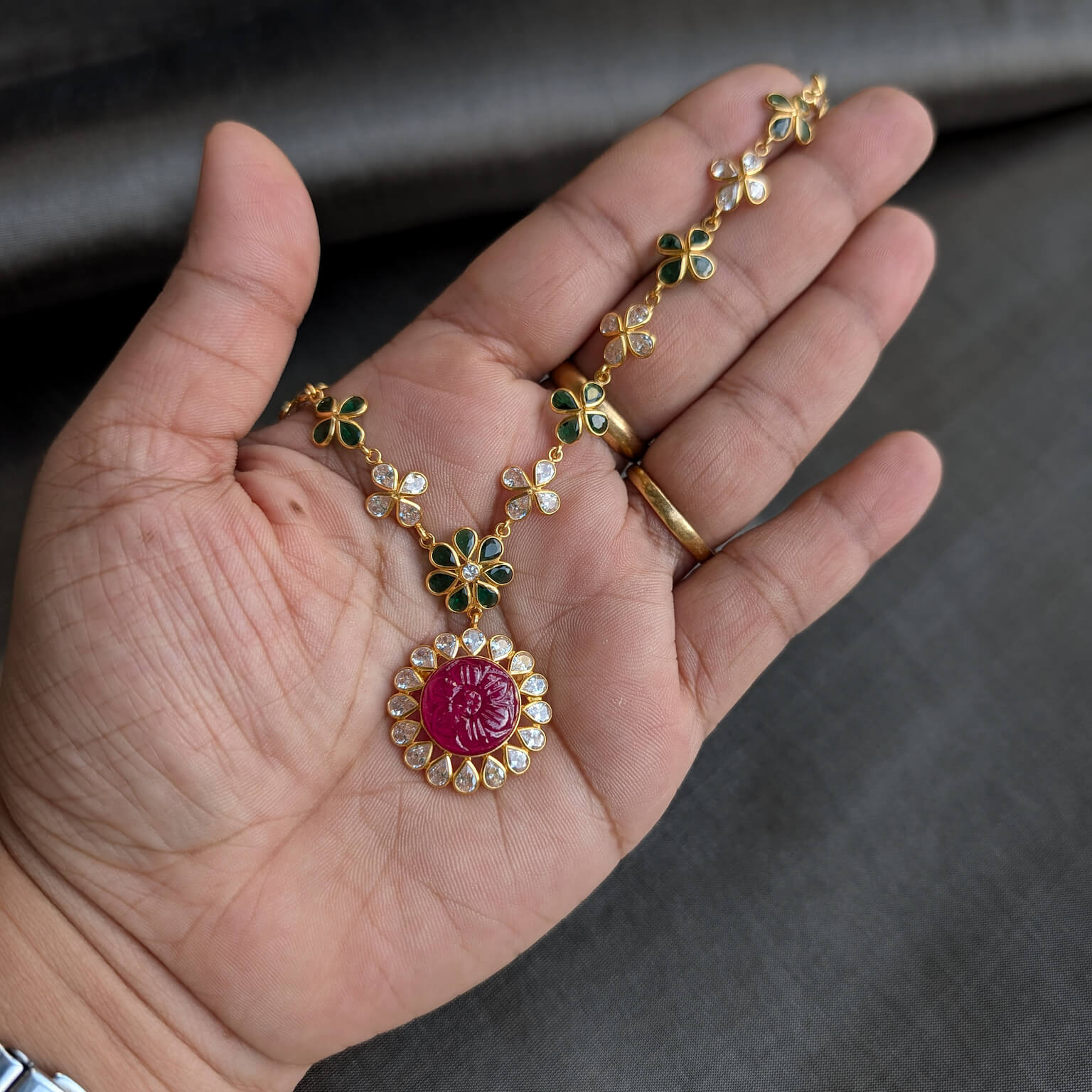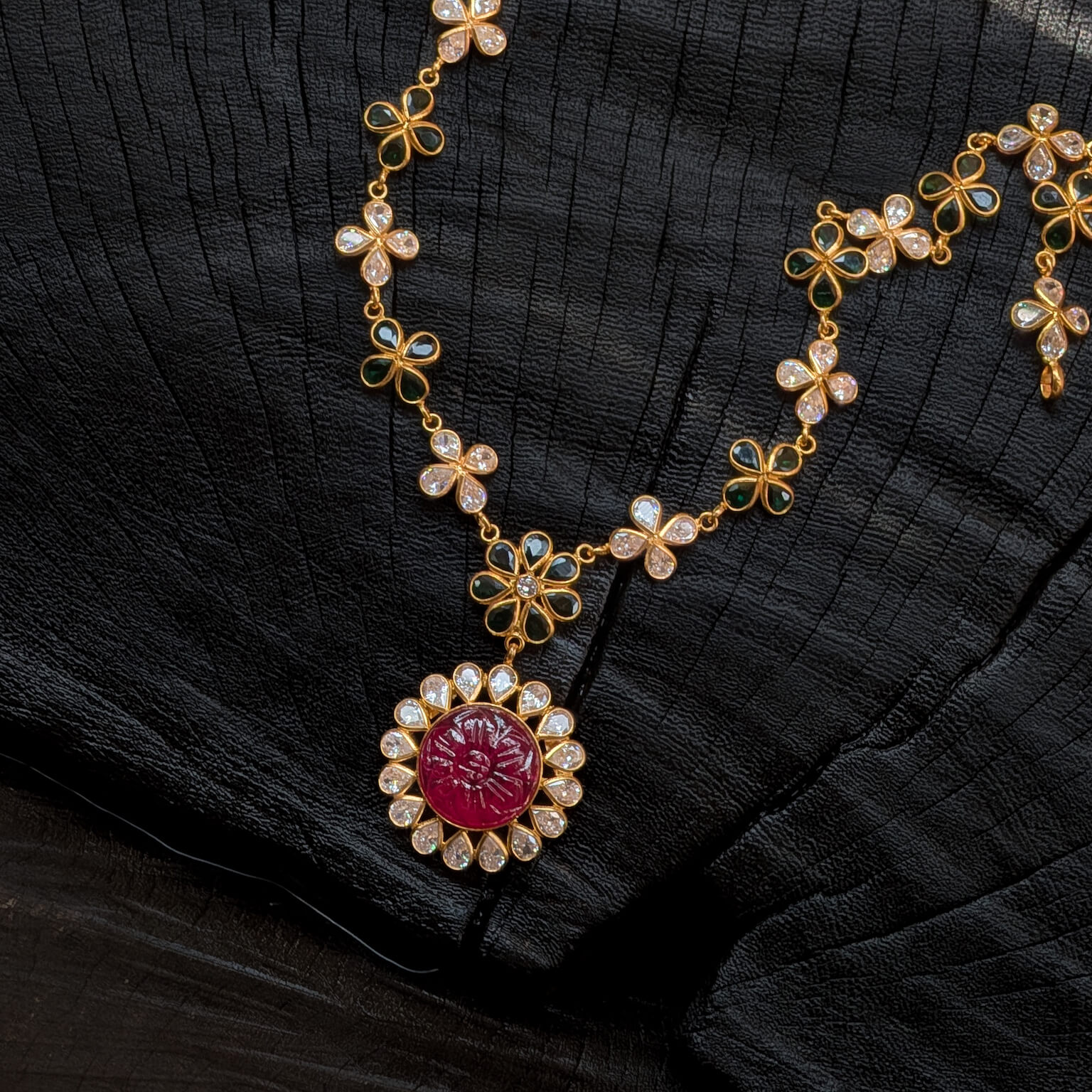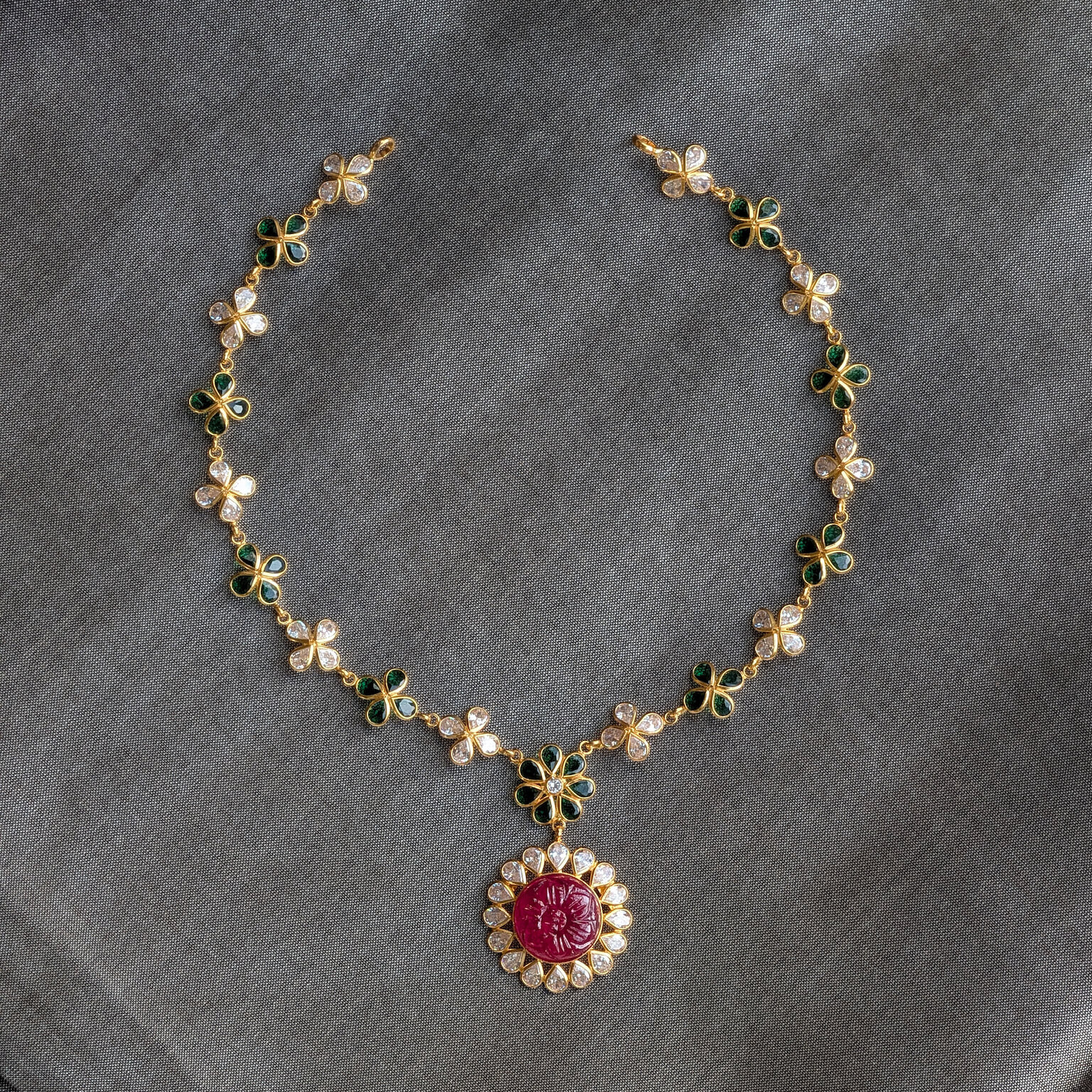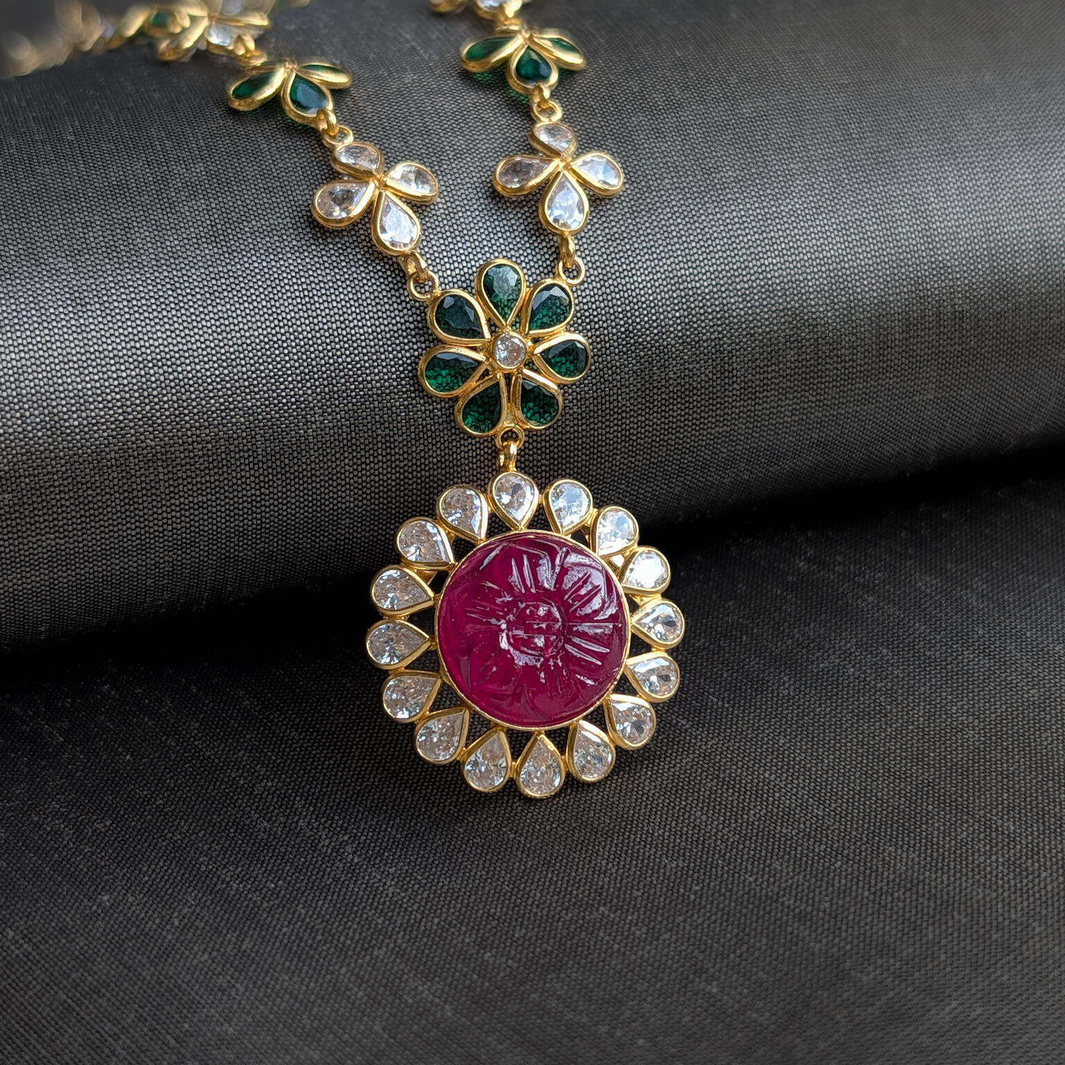 Tags: Color CZ, CZ, Gemstone Jewellery, Gifts For Her, Green Stone, Jadau, Necklace, Red Stone, Short, Synthetic Polki, Women