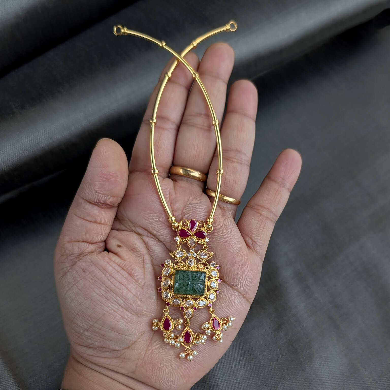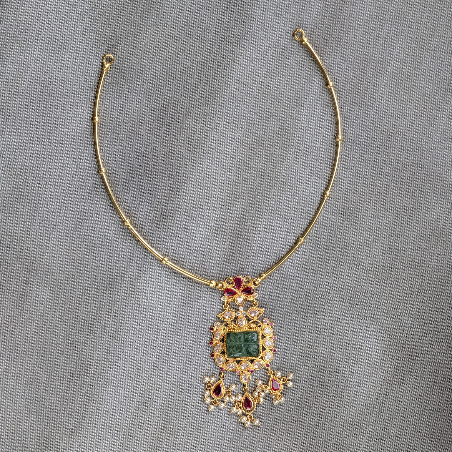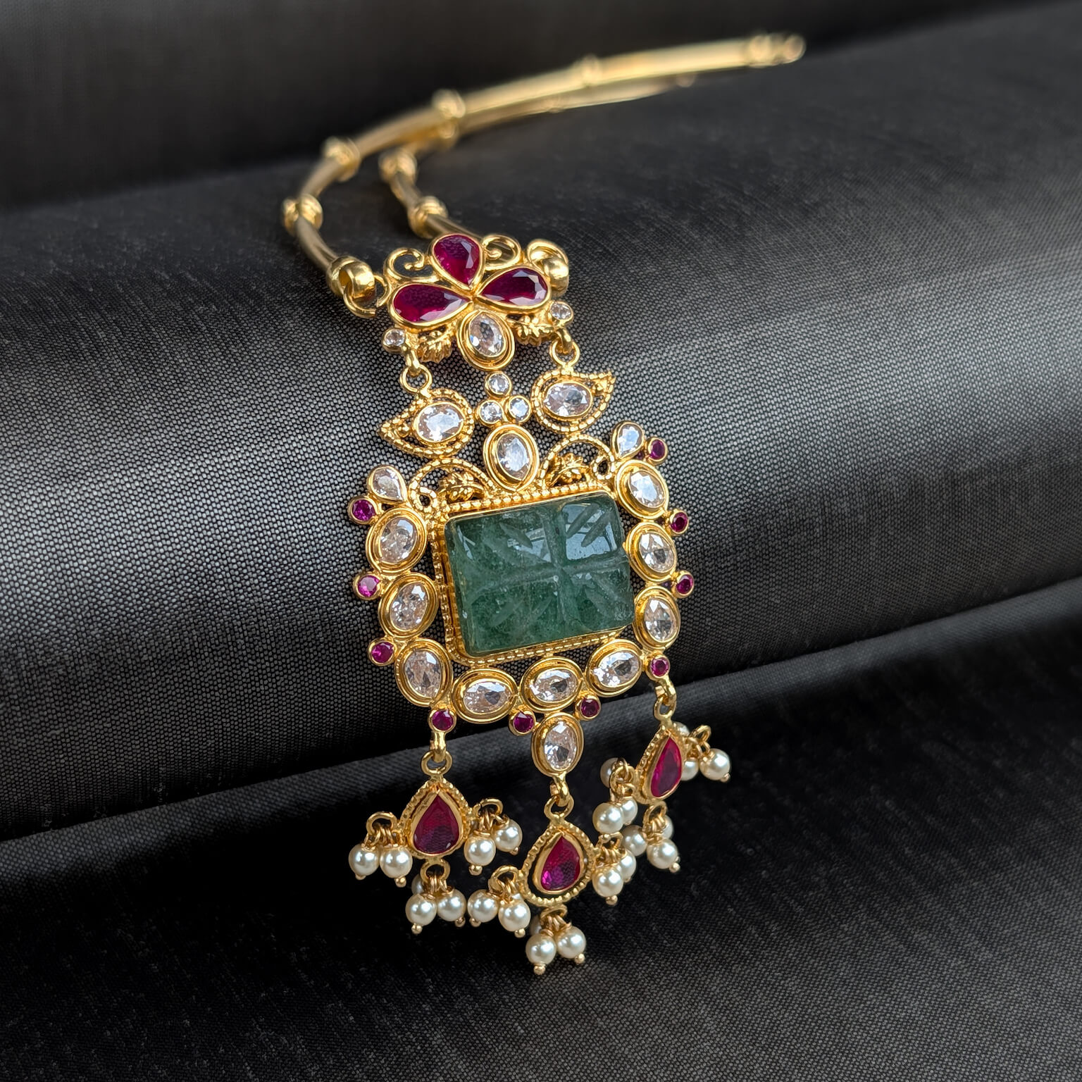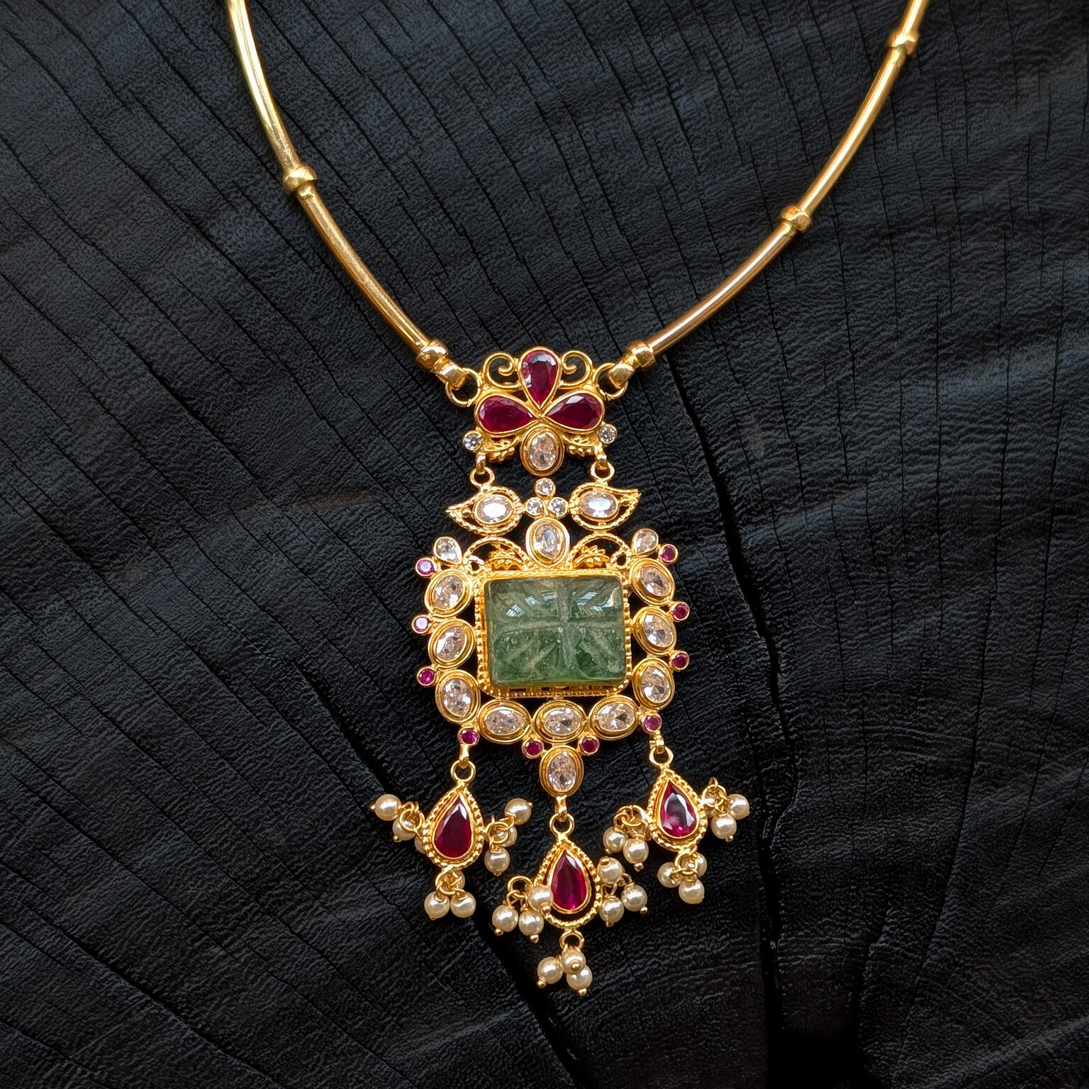 Tags: Color CZ, CZ, Gemstone Jewellery, Gifts For Her, Green Stone, Jadau, Kante, Necklace, Pearl, Red Stone, Short, Synthetic Polki, Women